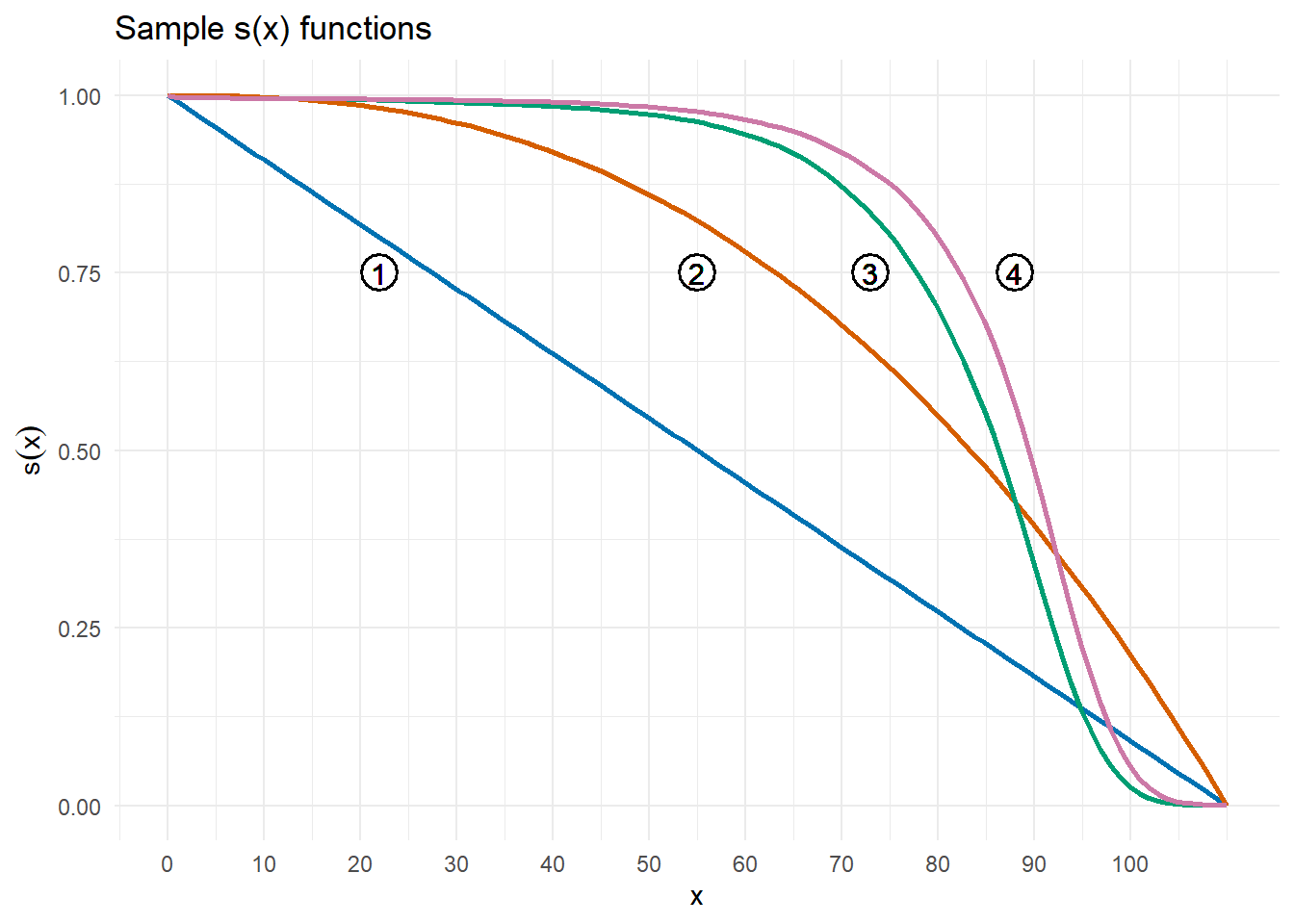 - \(s(x)\) is non-increasing in \(x\) (i.e., survival cannot increase with age)