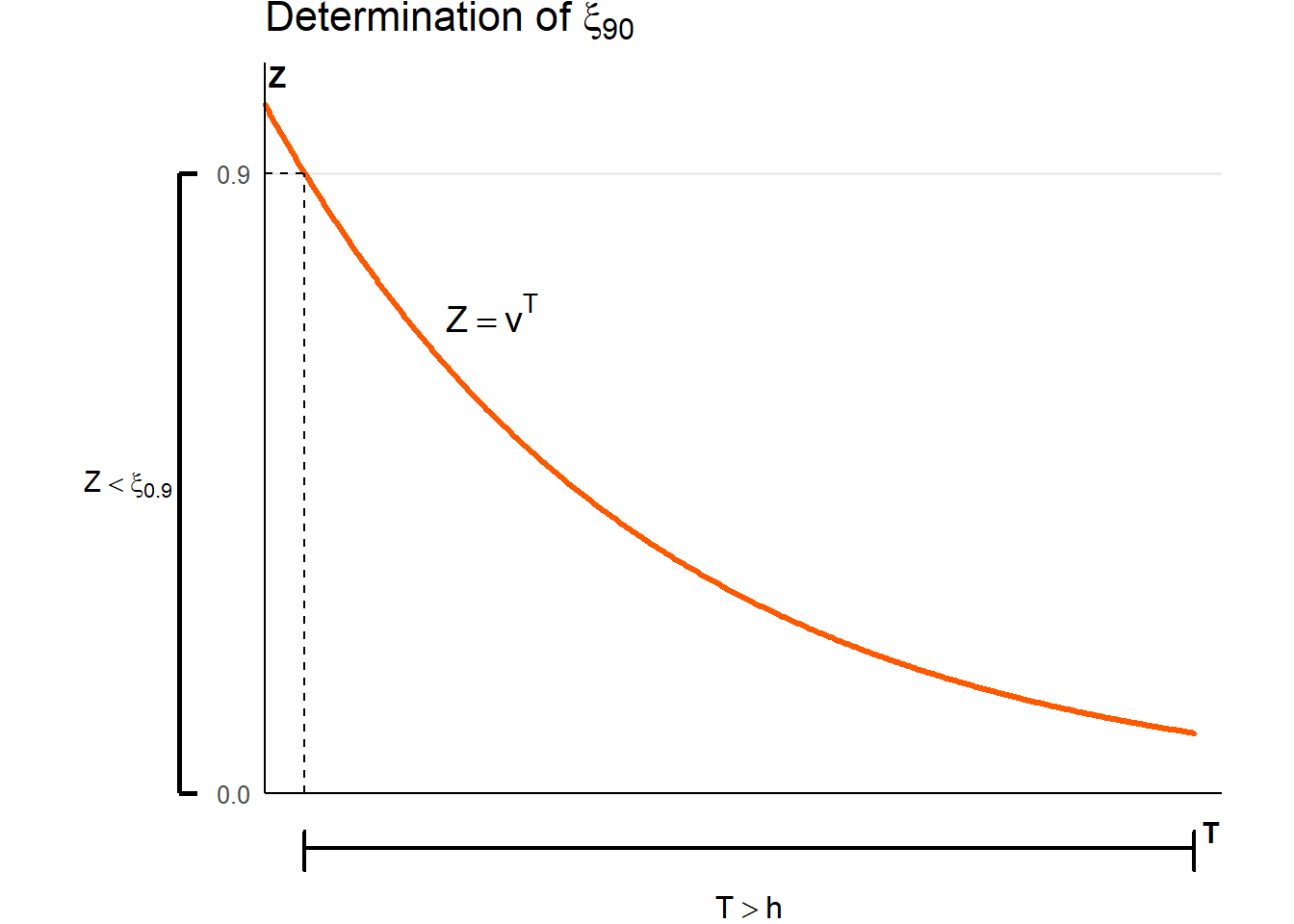 - To calculate percentiles of \(Z\) we use the fact that \(Z=v^T\) and use the probability density function of \(T\), not that of \(Z\) (since we don’t have it). The graph below illustrates the calculation of \(\xi_{90}\), the \(90^{\text{th}}\) percentile of \(Z\). We find an event for \(T\) that corresponds to \(\xi_{90}\). That event is \(_hp_x\).